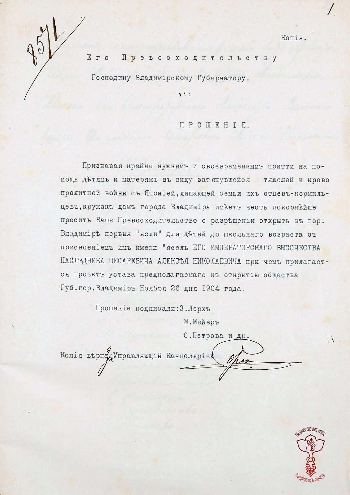В конце 1904 г. кружок дам города Владимира решил организовать в г. Владимире первые «ясли» для детей дошкольного возраста из семей защитников родины, чьи отцы воевали на фронтах русско-японской войны.